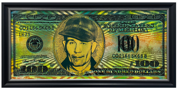 The exhibition 100 Bucks showcases Kuhn’s take on culturally loaded symbols and personas, specifically a cast of renegade influencers whom the artist deems as “Bucks.” This new series includes 38 unique works that appropriate the hundred dollar bill using screen-printing techniques, both core emblems of Pop Art in the Andy Warhol tradition. In these works, Kuhn has replaced the bills’ presidential portrait with notorious figures such as Jean-Michel Basquiat, Joey Ramone, Carl Sagan, and pro skater Jeff Phillips. Set against a hyper-saturated patterned background, this series recalls the psychedelic poster art of the 1960s at the apex of the Haight-Ashbury hippie era, when cult worship was also peaking.