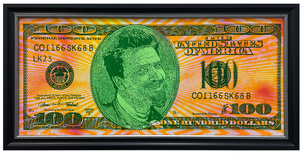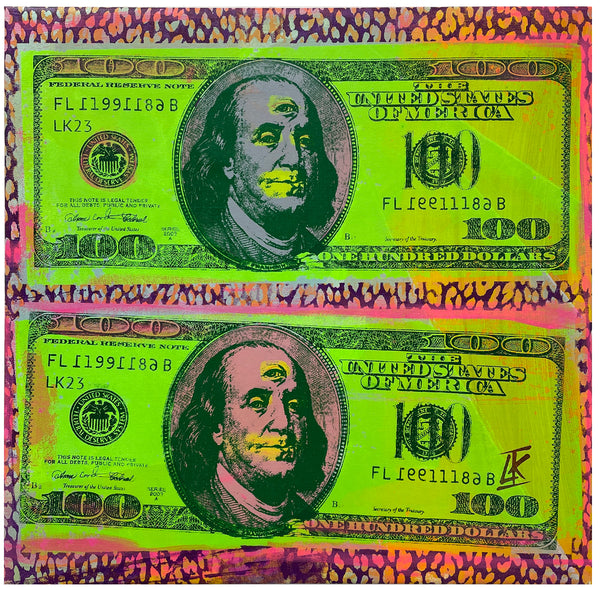 Like the cultural icons depicted in these artworks, Kuhn portrays the bill itself as a kind of historical relic — a testament to our changing values, both literally and figuratively. With Kuhn’s signature blend of satire and sarcasm, 100 Bucks pays irreverent homage to our society’s driving forces: money and celebrity.